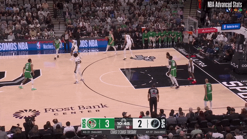 The Spurs’ defense is so good that they can even help off of the league’s best shooters without issue. Watch as Wemby blocks this shot at the rim; the real magic is in how quickly Devin Vassell (having a nice defensive season!) recognizes his rotation and sprints to Hauser in the corner. Vassell’s hustle didn’t even come close to mattering, but that’s the point:
