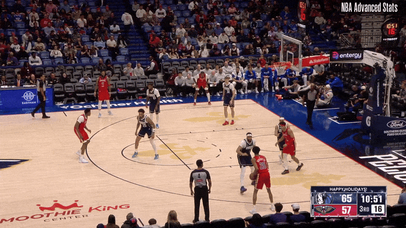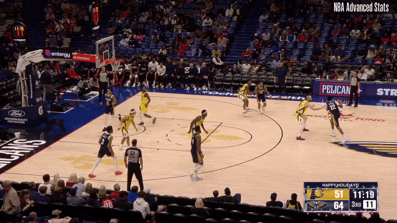 As I’ve highlighted before, Murphy has concocted immediate chemistry with the sweet-slingin’ rookie center, Derik Queen, who constantly looks for Murphy on backdoor alley-oops or whip-quick catch-and-release threes. Murphy has also upped his screening game, running occasional inverted pick-and-pops that morph into a flare screen for Murphy. I’d like to see this semi-improvised play used more often and with more urgency:
