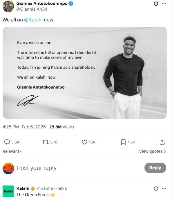 NBA players are not allowed to invest in sports betting platforms like FanDuel or DraftKings (though they are certainly allowed to shill for them!). Still, because Kalshi is a “prediction market”, Giannis has not done anything illegal by announcing his ownership. It’s just icky.