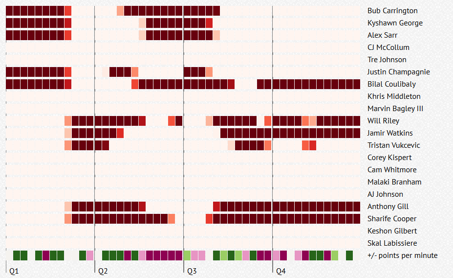 The newfangled form we’re seeing more often is a team playing its best guys for a few quarters and then sitting them in the fourth. That’s how we see rotations like this one from Washington, in which they sat four of their five starters not halfway through the third quarter in favor of Sharife Cooper and Anthony Gill: