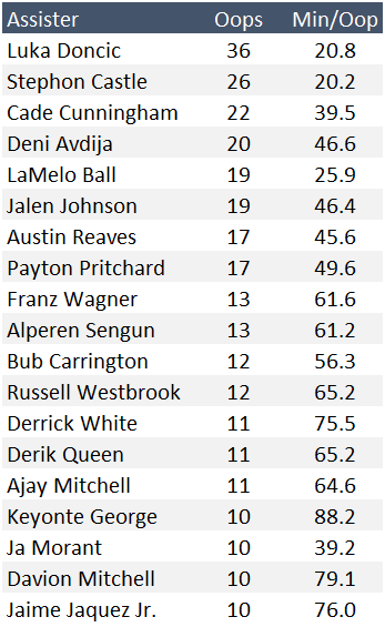 In case you’re wondering, Nikola Jokic just missed the cutoff, with nine oops tossed. The injury to Aaron Gordon really hurt him in the alley-oop department.