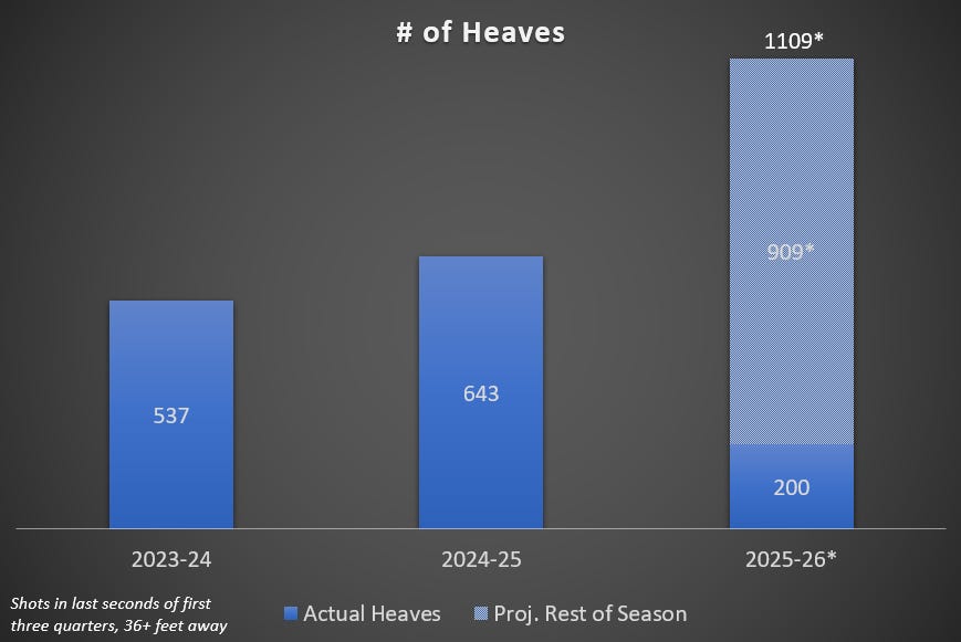 Doubling is a significant increase, but perhaps not quite as dramatic as I personally expected. That might be because we were already “heaving” more than I realized, at least as the NBA defines it now. Before, there was one heave roughly every other game; now, you’d expect to see one in any contest.